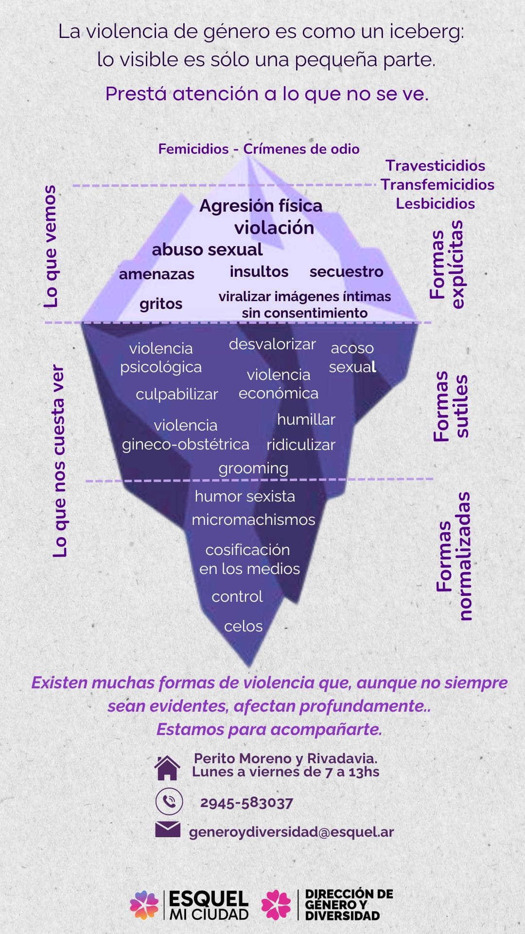 Dichas violencias pueden manifestarse de manera explícita, pero muchas otras toman formas más sutiles y naturalizadas. El iceberg de las violencias de género es una herramienta elaborada por Amnistía Internacional, que permite visibilizarlas, repensar las desigualdades de poder y cómo desde nuestros lugares, ámbitos y círculos podemos contribuir a frenar las violencias de género.